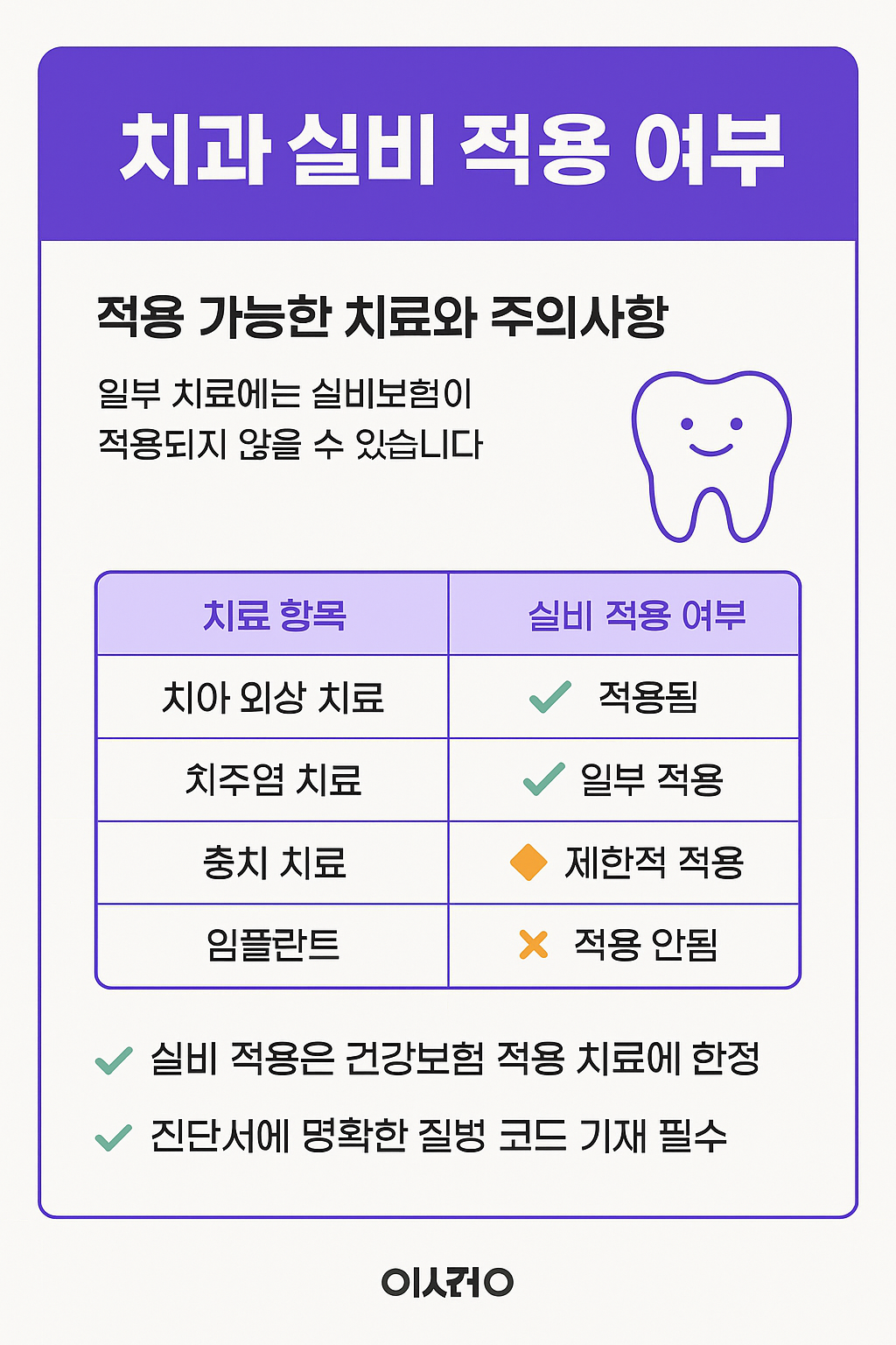 - 건강보험 적용 여부와 치료 목적(심미/질병)을 꼭 확인